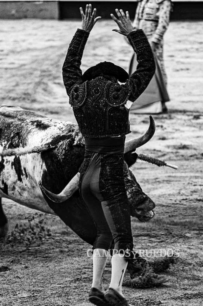 Mais João Ferreira n’est pas voûté, ni plus adolescent. Il est torero de plata, frère d’un matador de toros et maître dans l’art de poser les banderilles. Il est Portugais. En soi, cela n’a aucune importance mais la banderille est à la tauromachie portugaise ce que l’épée devrait être à l’espagnole : le coeur de la lidia. Et même si le Portugal plante les farpas du haut de canassons magnifiques, il est agréable d’imaginer que la nationalité a dû avoir quelque influence sur la technique de ce jeune peón. João Ferreira pose les banderilles dans la cuadrilla de Javier Castaño dont on connaît la vista pour dénicher des subalternes de grand talent. L’on se souvient des heures de gloire du duo Fernando Sánchez / David Adalid. Ferreira a pris la suite avec une superbe unique, à la fois spectaculaire et chiche d’artifices. Il s’avance vers le toro sur la pointe des pieds, un rien timide, presque trop discret. C’est après qu’il occupe l’espace complet du ruedo et des yeux. Après. Quand il se retrouve face au berceau des cornes, quand il faut être précis, rapide, efficace. D’abord, il vole. S’étirant dans une ligne courbe idéale au-dessus de la cible qui charge. Sans exagérer, avec ce visage de gosse et dans cet envol parfait, il remémore la geste de Nimeño II. Ensuite, après avoir plané, il plante. Il dépose les banderilles à l’endroit précis où elles doivent l’être, sans rage ni démonstration de force, le corps inscrit alors au milieu du frontal, précisément au centre. C’est cette maîtrise totale du « timing », de l’instant qui époustoufle et fait rugir. João Ferreira vole, nous l’avons vu.